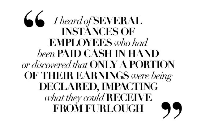 Almost from the outset, it was clear that some employees were unhappy when they discovered they weren’t entitled to furlough payments. I heard of several instances of employees who had been paid cash in hand and weren’t “on the books”, or discovered that only a portion of their earnings were being declared, impacting what they could receive from furlough.