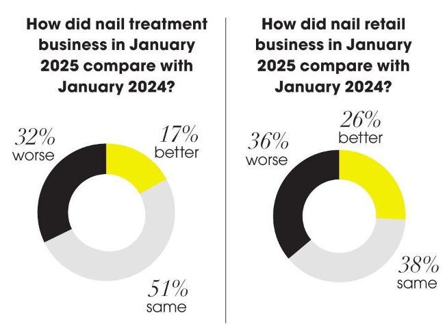 The new year began on solid ground for many nail businesses, with 51% reporting stable treatment demand and 17% seeing growth compared to January 2024. Retail business also showed resilience, with 26% experiencing an increase in sales.
