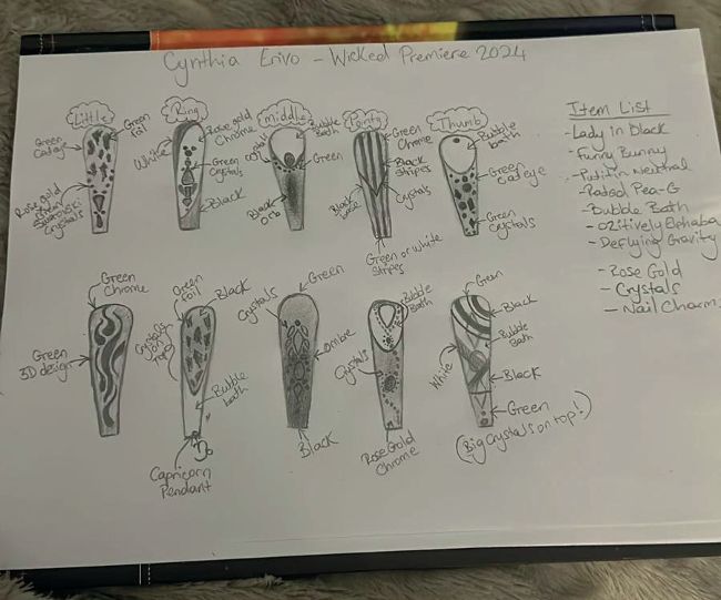 If you’ve seen Wicked, I’m sure you can grasp the magnitude of the production, and as Erivo insisted on doing her own stunts, despite her character Elphaba having long and meaningful nails, Osei needed to make over 33 sets for two looks.