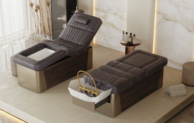 Venice Head Spa is a multifunctional treatment bed that integrates massage, manicure, pedicure and head-washing functions. A retractable drawer reveals a wash basin with hand shower, enabling scalp massage and Japanese-style head spa treatments. The unit also features memory foam, electric adjustment of height, backrest and legs, and integrated memory settings for personalised treatments. For pedicures, a pipeless hydromassage basin is fitted for hygiene, while adjustable armrests support manicure work.