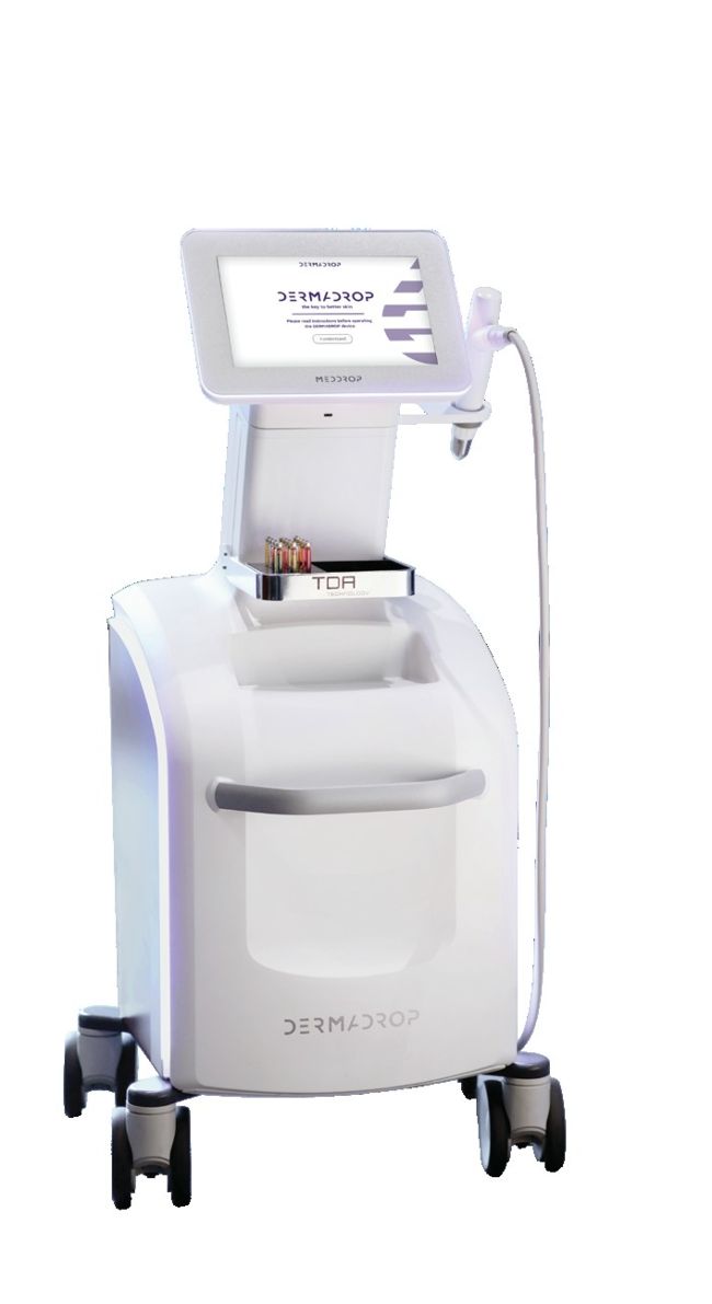 Dermadrop is a needle-free, non-invasive infusion device that delivers active ingredients into the skin using patented LP3-Complex technology and pure oxygen. The contactless system enables deep penetration without needles or discomfort. Manufactured in Germany, it uses targeted cartridges to address a range of skin, scalp, and nail indications, offering controlled delivery with high patient comfort.