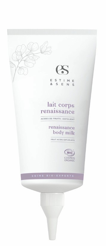 Renaissance Body Milk from Estime & Sens promotes cell renewal while providing ultra-soft skin; it contains objectified fruit acids – a naturally-derived acid complex consisting of lactic, glycolic, citric, tartaric and malic acids – that gently exfoliate rough, dry skin, along with glycerin, shea butter and aloe vera to support repair and hydration.