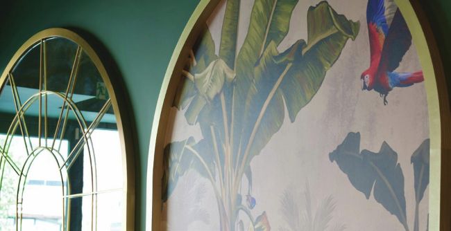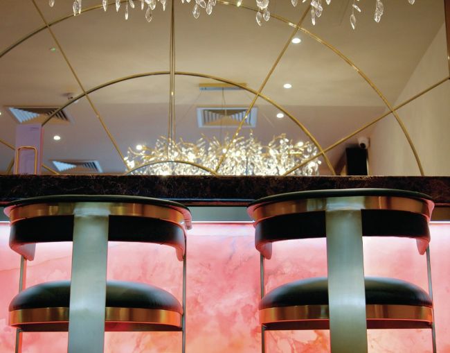 Every aspect has a story. “The bar is one of my favourite parts. It’s made of pink onyx, which took months to find the perfect stone. And the bathrooms complete the experience,” he continues. “I designed it with a vision of walking through a rainforest – when you get to the bathrooms it’s as if you dive under water, with the fish wallpaper and fish scale-like images.”